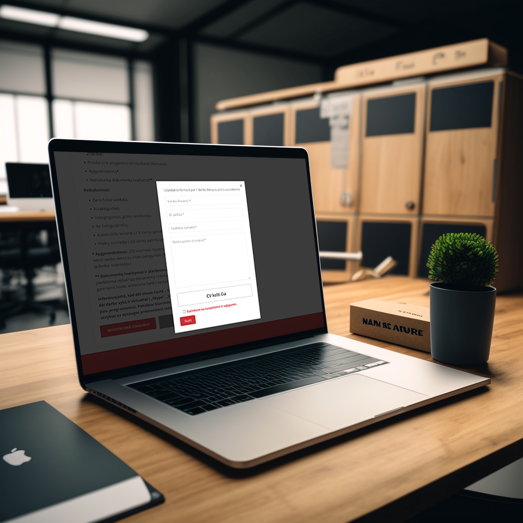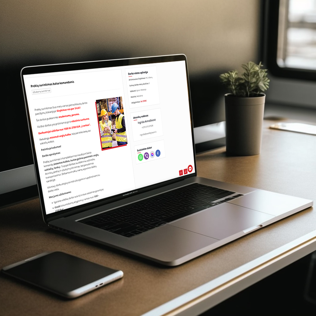 Mes sukūrėme ir adaptavome unikalų svetainės dizainą. Kuriant dizainą daugiausia dėmesio skyrėme tam, kad potencialus kandidatas galėtų lengvai ir greitai surasti jam tinkamą darbo poziciją, visą reikalingą  informaciją ir užpildyti kandidatavimo formą arba iškart nusiųsti savo CV.